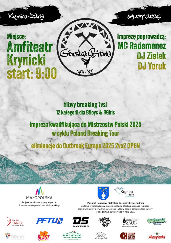 Fundacja Dla Wszystkich, Centrum Kultury w Krynicy-Zdroju, Urząd Miasta w Krynicy-Zdroju, Urząd Marszałkowski Województwa Małopolskiego oraz grupa Butterfly Crew serdecznie zapraszają na 11 edycję Górskiej Bitwy, która odbędzie się 19 lipca 2025 w Krynicy-Zdroju!